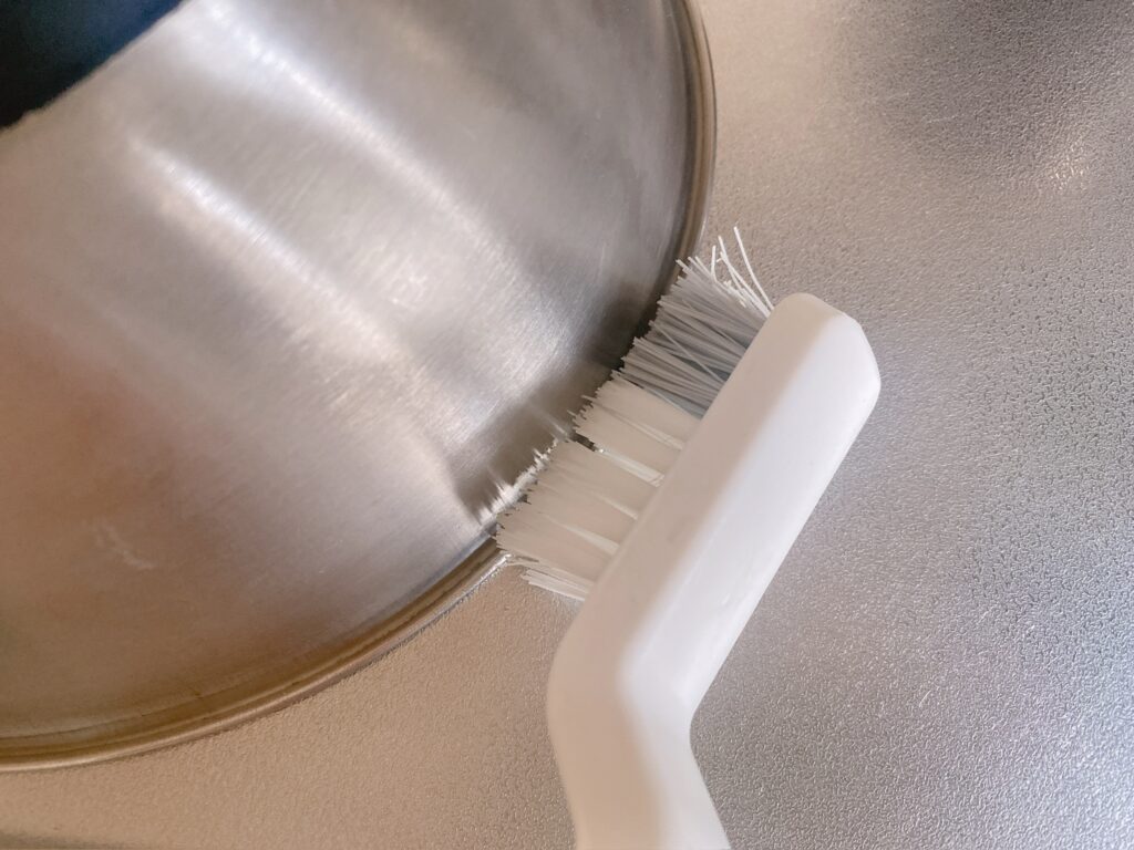 なかなか食材が取れない時は、ざるが乾いた状態で、食材がカピカピになっている時にブラシでがしがし取っていきます。