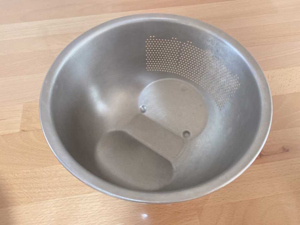 ざるが強敵!!!この「ふち」と網目の隙間に食材が入り込んでいます!!